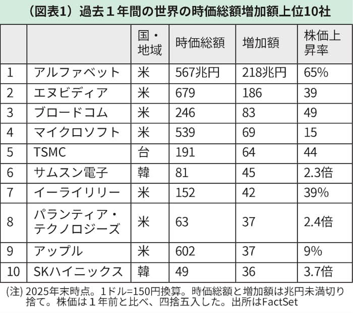 生成AI開発は参入者が多くかつコストが大きいため、事業としては利益が出しにくい。たとえば、オープンAIの企業価値は約75兆円(CBインサイツ推計)だが、24年度は約8000億円の赤字であった。一方、半導体企業は参入障壁が高いため、これらの利益率は高い。25年の世界の株価上昇率上位は、SKハイニックス(3.8倍)、マイクロン・テクノロジー(3.4倍)など半導体関連である。