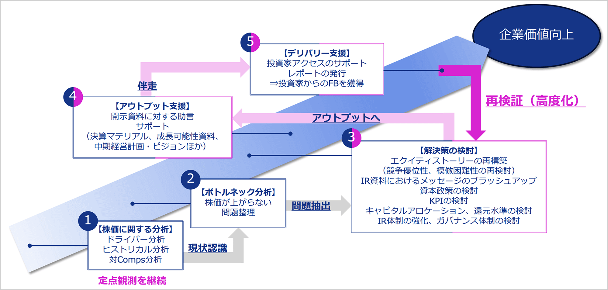 資本戦略やエクイティストーリーの策定と、それらを株式市場の言葉で説明するための取り組みを支援します。