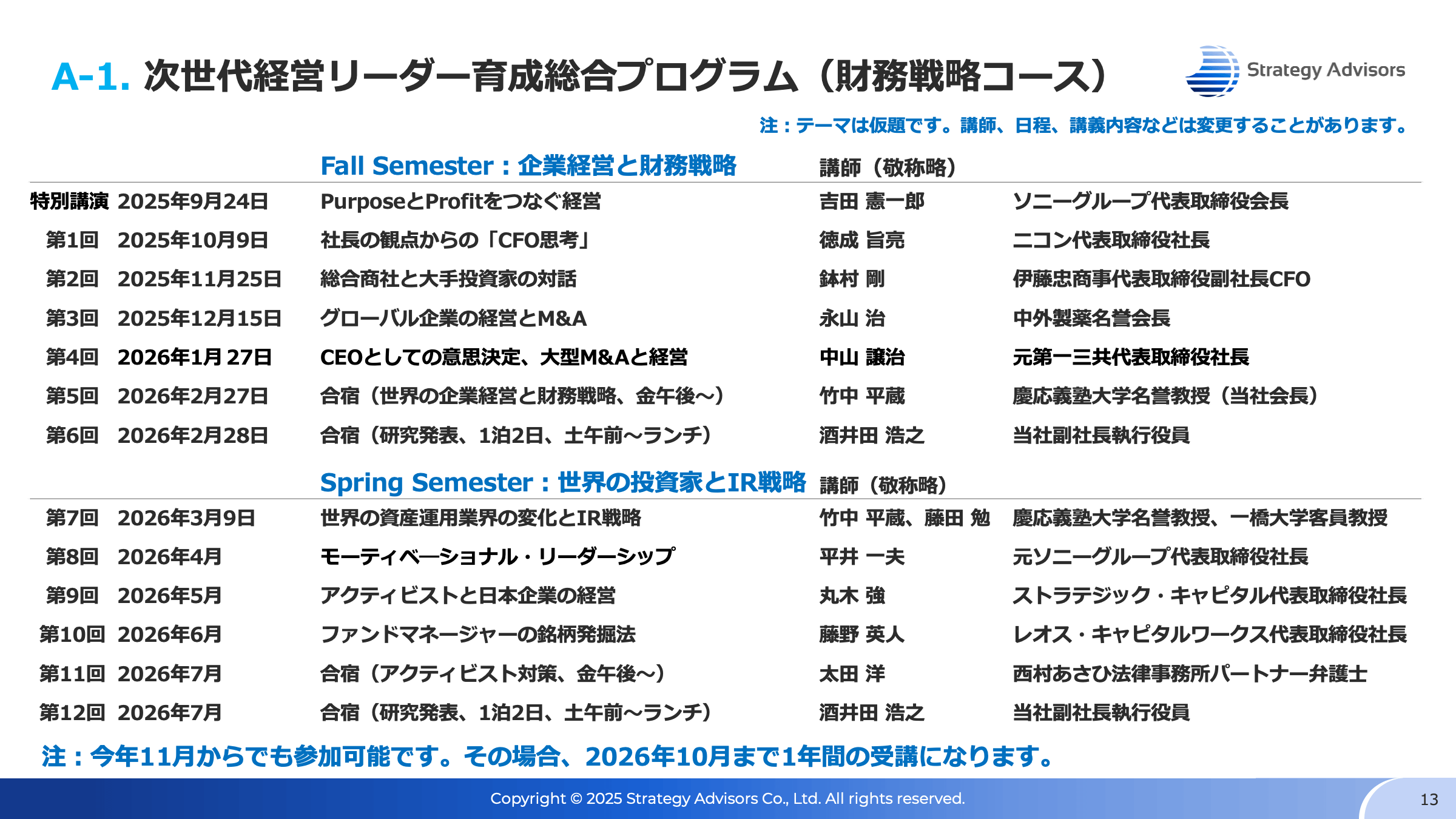 私たちのプログラムは、経営、財務、人事、ESG、IRなど戦略に関心のある次世代経営リーダー候補の育成を目的としております。受講者の年齢は30代、40代を想定していますが制限はありません。 受講者は研修に年12〜13回、研究会に年6〜12回参加します。