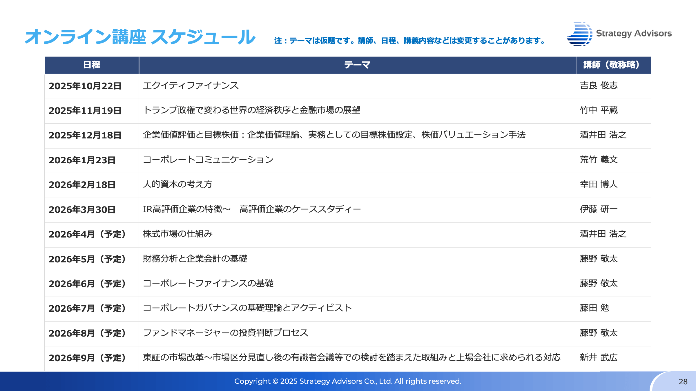 オンライン講座では、弊社アナリスト、コンサルタントが講師となり、財務分析やコーポレートファイナンス、資本市場に関する講座などを予定しています。